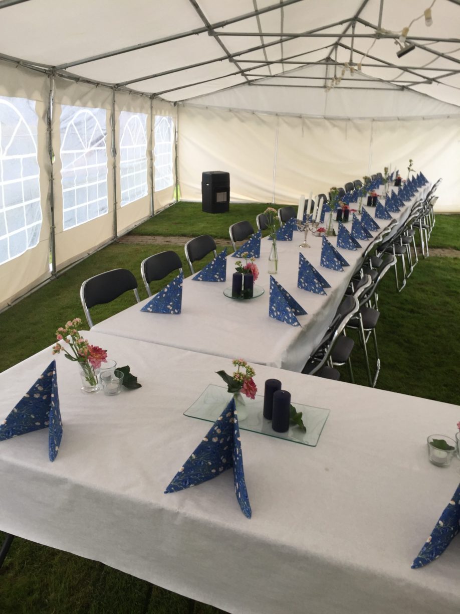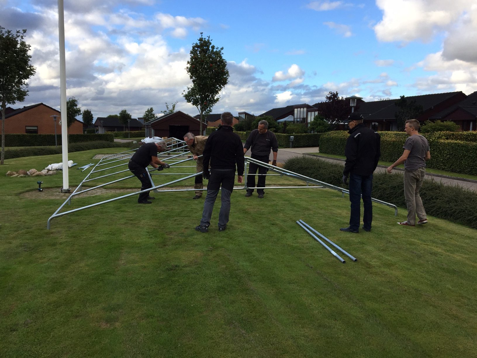 Mænd med drivkraft sætter telt op i strid blæst, men dog tørvejr. Kvinderne har dækket smukt op, og snart er vi klar til gadefest 2017!